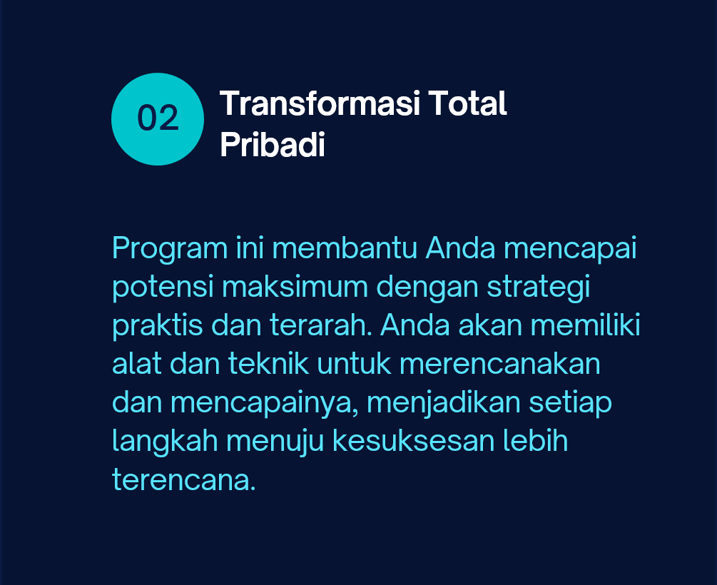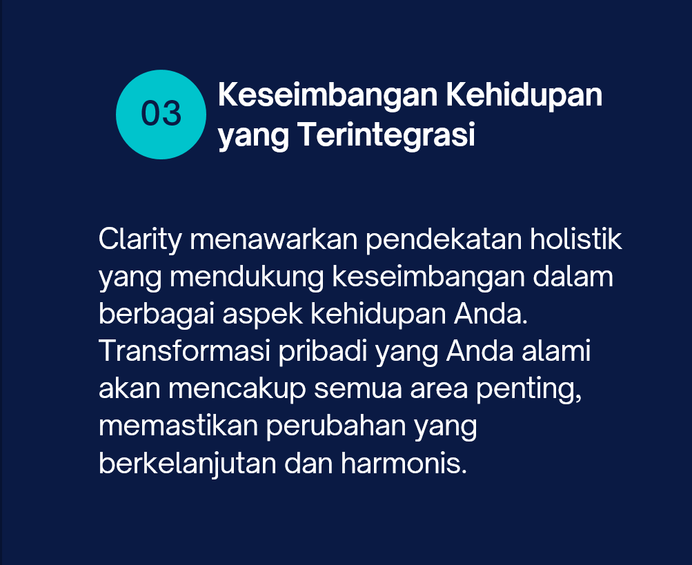 Dengan panduan Clarity, Anda dapat memulai perjalanan menuju transformasi total, baik dalam kehidupan pribadi maupun profesional. Wujudkan visi hidup Anda dan raih potensi penuh Anda dengan langkah-langkah nyata dan terukur. Ambil kendali atas masa depan Anda dan rasakan perubahan positif mulai hari ini!